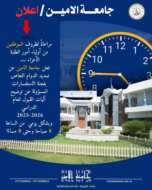 مراعاةً لظروف الموظفين من أولياء الأمور للطلبة الأعزاء تعلن جامعة الامين عن تمديد الدوام بلجنة الاستفسارات المسؤولة عن توضيع آليات القبول للعام الدراسي 2025-2026 وبشكل يومي من الساعة 8 صباحا وحتى 8 مساءًا